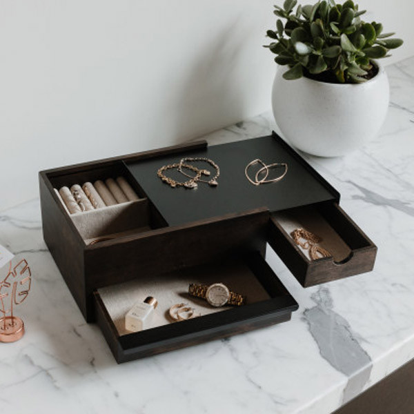 دارای محفظههای مختلف برای قرار دادن گوشواره، حلقه، ساعت و...